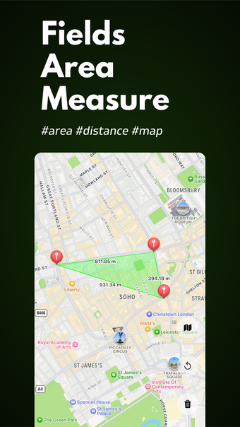 Kluczowe funkcje obejmują konwersję jednostek, umożliwiającą uzyskiwanie wyników w metrach kwadratowych, hektarach i akrach, wraz z wszechstronnymi opcjami pomiaru do obliczania powierzchni i odległości między punktami. Użytkownicy mogą bez wysiłku umieszczać pinezki na mapie, dostosowywać widok dla przejrzystości i edytować pomiary interaktywnie. Aplikacja upraszcza proces pomiaru dzięki prostemu przepływowi pracy, który oblicza powierzchnię po umieszczeniu trzech lub więcej pinezek, co czyni ją niezbędnym narzędziem do różnych zadań związanych z gruntami.
